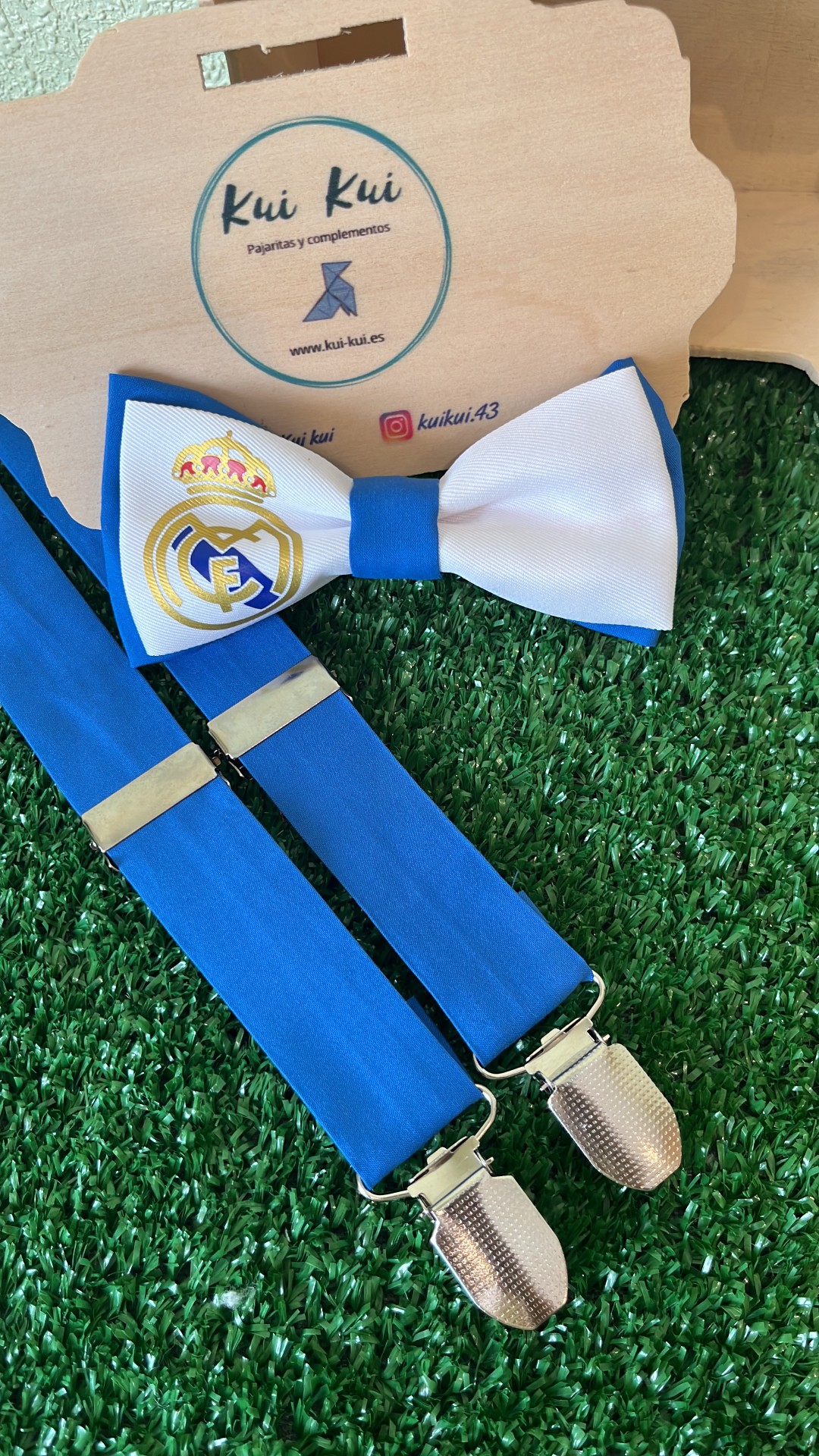 Pajarita con escudo en vinilo y tirantes de tela azules.